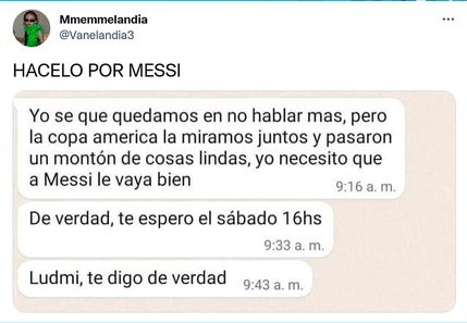 Un usuario le habló a su exnovia para juntarse a ver el próximo partido de la Selección con el solo motivo de que a Lionel Messi “le vaya bien”. La cuenta @Vanelandia3 compartió la captura de una conversación entre una expareja con un pedido sumamente especial. “Yo sé que quedamos en no hablar más, pero […]